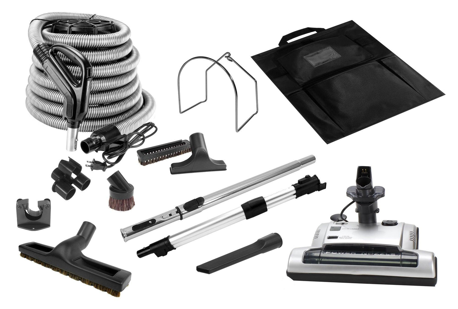 Central Vacuum Kit - 30' (9m) Electric Hose with Ergonomic Handle - Power Nozzle - Floor Brush - Upholstery Brush - Dusting Brush - Crevice Tool - Telescopic Wand - Grey