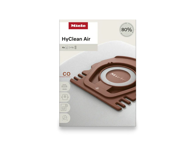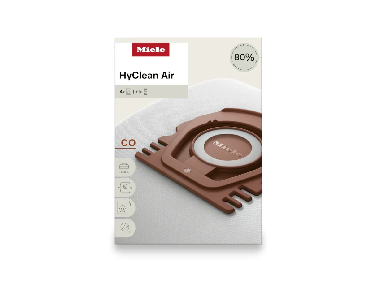 The Miele CO HyClean Air dustbags are designed for exceptional cleaning performance and hygiene. Made from up to 80% recycled materials, these innovative dustbags ensure outstanding suction power, maximum dust retention, and a longer service life — setting a new standard for sustainability and efficiency.