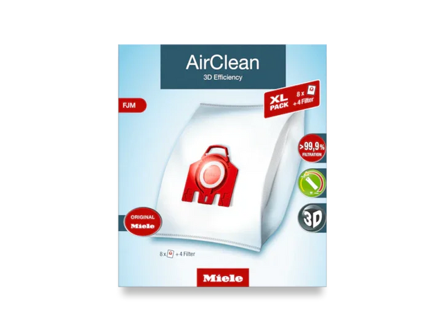 Feature Details Bag Type FJM AirClean 3D Efficiency Pack Size 8 dustbags Additional Filters 2 motor protection filters, 2 exhaust filters Filtration Efficiency Traps >99.9% of fine dust particles Design 3D bag shape for maximum capacity use Closure System Automatic hygienic sealing (HyClose) Compatible Miele Vacuum Models