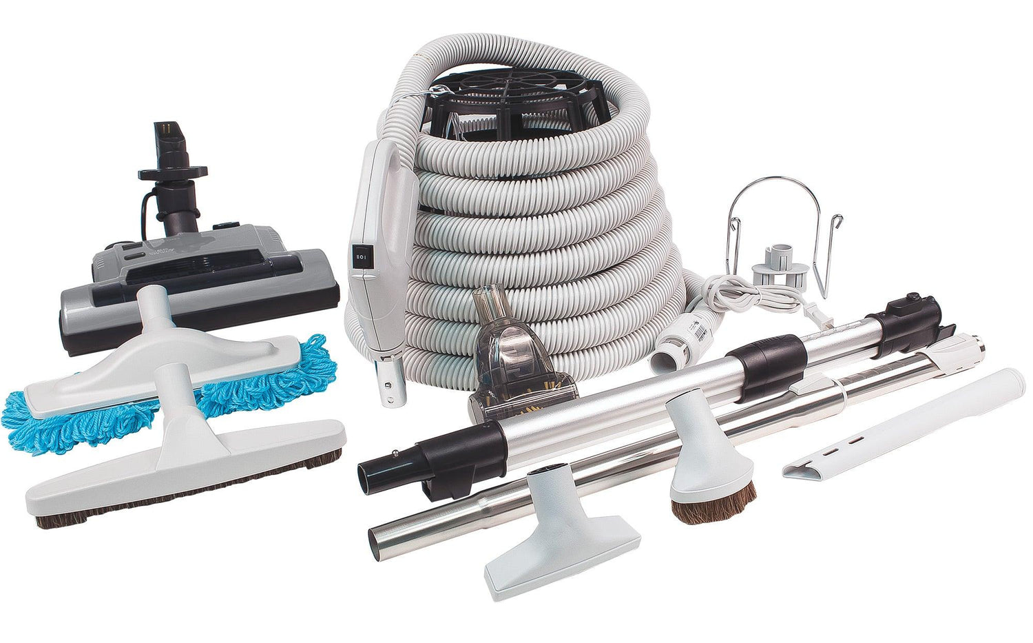 Central Vacuum Kit - 30' (9 m) Electrical Hose - Silver Power Nozzle - Mini Air Nozzle - Floor Brush - Dusting Brush - Upholstery Brush - Microfiber Brush - Telescopic Wand - Hangers - Grey