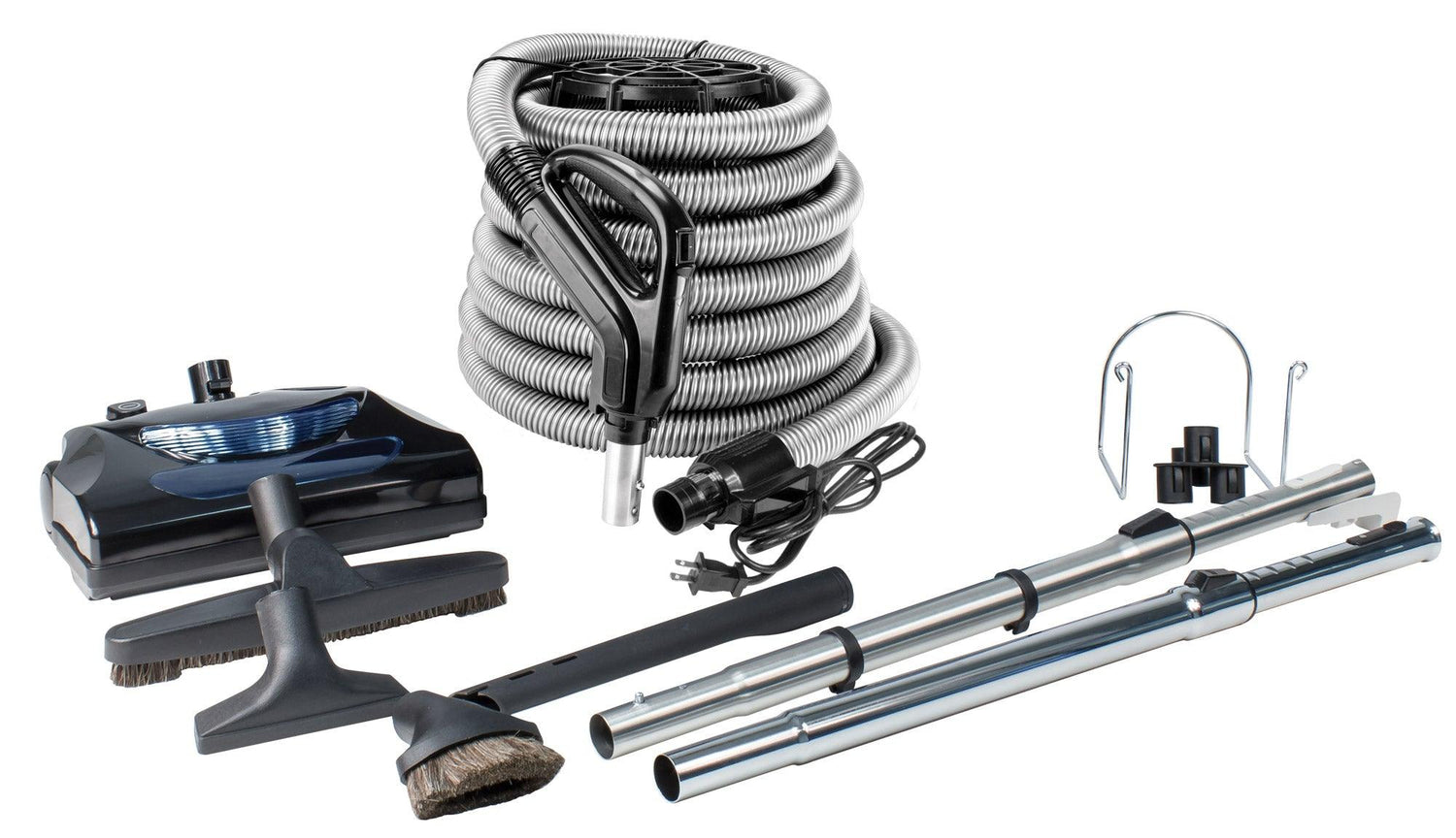 Central Vacuum Kit - 35' (10 m) Silver Electrical Hose - Power Nozzle - Floor Brush - Dusting Brush - Upholstery Brush - Crevice Tool - 2 Telescopic Wands - Hose and Tools Hangers - Black