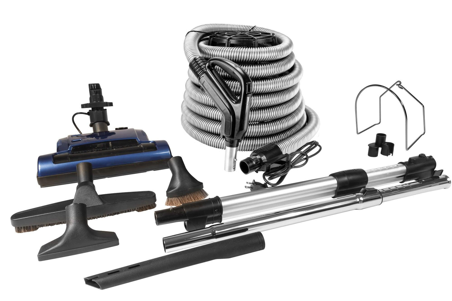 Central Vacuum Kit - 35' (10 m) Silver Electrical Hose - Blue Power Nozzle - Floor Brush - Dusting Brush - Upholstery Brush - Crevice Tool - Telescopic Wand - Hose and Tools Hangers - Black
